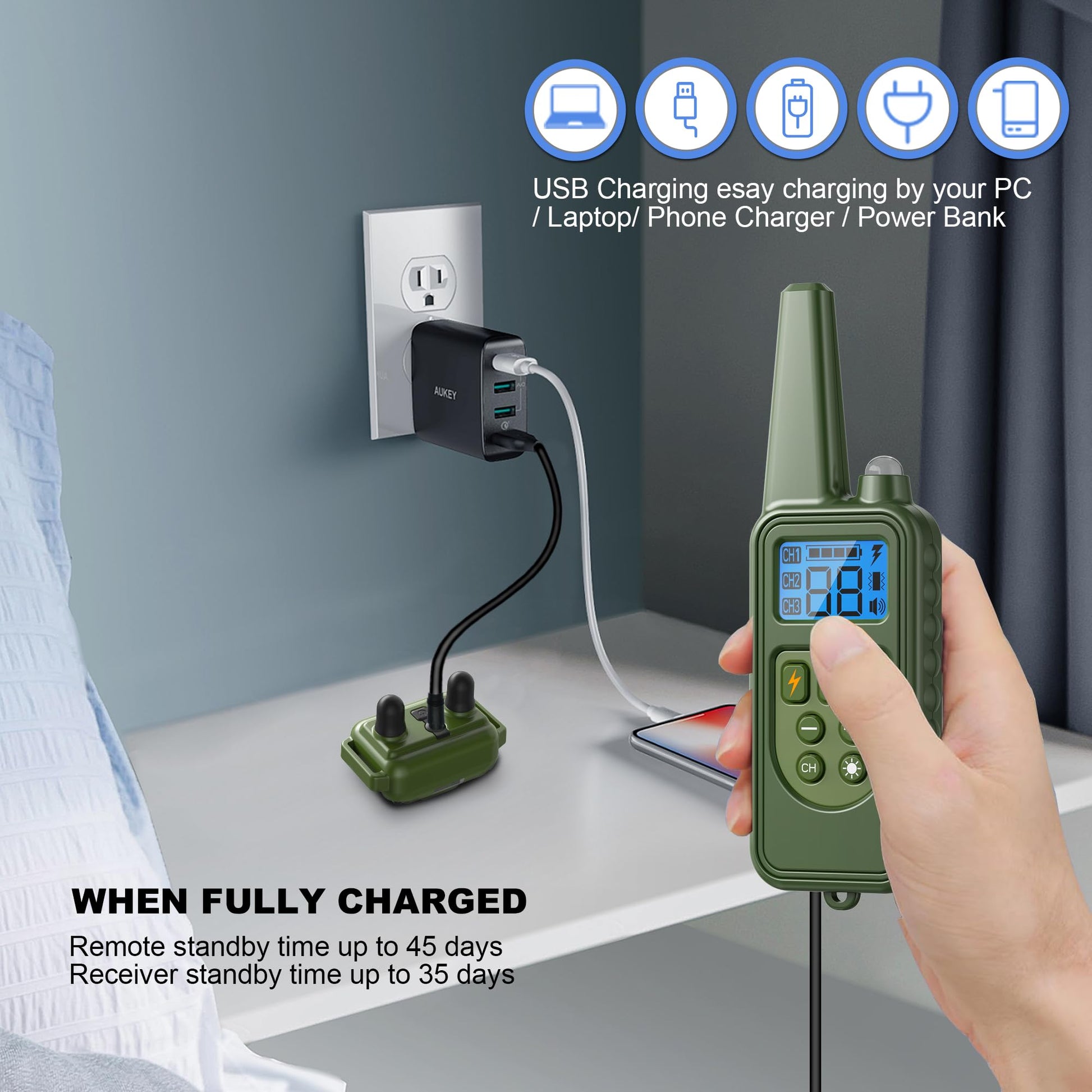• Rapid Charging: Charge the Heaflex dog training collar in just 2.5 hours with USB. The receiver lasts up to 35 days on standby, and the remote up to 45 days. Quick recharging and long battery life ensure reliable and efficient training sessions.