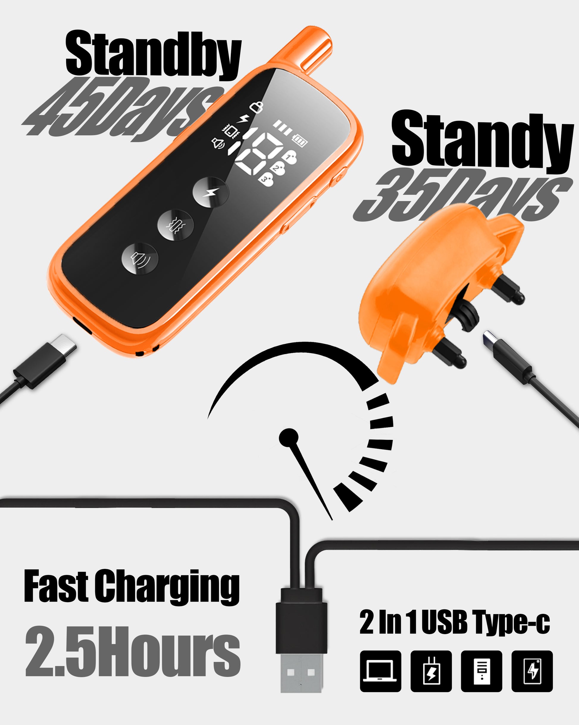 • 【Fast Charging & Long Battery Life】Dual 2-in-1 charger charges both electric collar and remote in just 2.5 hours through power bank, adapter, computer and other device. Remote lasts up to 45 days standby, receiver up to 35 days—perfect for daily training, weekend trips, or camping with your dog.